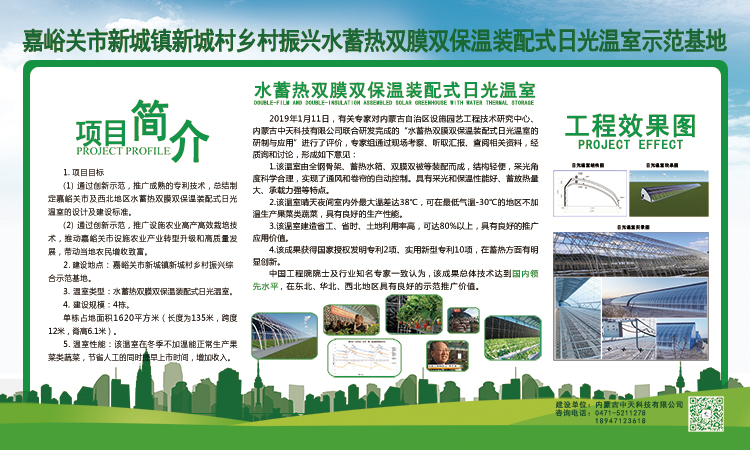 嘉峪關(guān)市新城鎮(zhèn)新城村鄉(xiāng)村振興水蓄熱雙膜雙保溫裝配式日光溫室示范基地水蓄熱雙膜雙保溫裝配式日光溫室是由內(nèi)蒙古農(nóng)業(yè)大學(xué)與內(nèi)蒙古中天科技有限公司聯(lián)合研發(fā)完成,并已在東北、西北、華北等地區(qū)進(jìn)行了大面積的示范推廣。該溫室集成了10多項專利技術(shù),實現(xiàn)了北方寒冷地區(qū)冬季不加熱正常生產(chǎn)果菜類蔬菜,對于促進(jìn)設(shè)施蔬菜產(chǎn)業(yè)發(fā)展及帶動當(dāng)?shù)剞r(nóng)民增收致富有著非常重要的意義,該溫室具備以下特點: