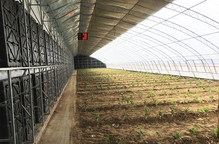 水蓄熱內(nèi)保溫裝配式日光溫室是由內(nèi)蒙古農(nóng)業(yè)大學(xué)與內(nèi)蒙古中天科技有限公司聯(lián)合研發(fā)完成,并已在東北、西北、華北等地區(qū)進(jìn)行了大面積的示范推廣。該溫室集成了10多項(xiàng)國(guó)家專利技術(shù),實(shí)現(xiàn)了北方寒冷地區(qū)冬季不加熱正常生產(chǎn)果菜類蔬菜,對(duì)于推動(dòng)設(shè)施蔬菜產(chǎn)業(yè)發(fā)展及帶動(dòng)當(dāng)?shù)剞r(nóng)民增收致富有著非常重要的意義,該溫室具備以下特點(diǎn):