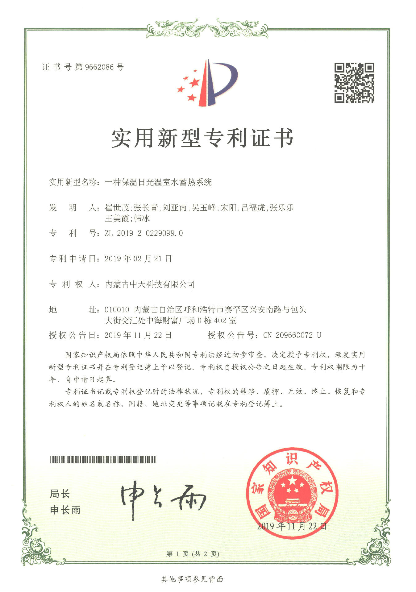 2019年11月22日,公司經(jīng)過(guò)長(zhǎng)期對(duì)日光溫室的研究、實(shí)驗(yàn)、改進(jìn)終于又獲得了2項(xiàng)實(shí)用新型專利證書,分別是一種保溫日光溫室后墻和一種保溫日光溫室水蓄熱系統(tǒng)。一種保溫日光溫室后墻是采用全鋼骨架,具有結(jié)構(gòu)輕便、采光角度科學(xué)合理和承載力強(qiáng)等特點(diǎn),一種保溫日光溫室水蓄熱系統(tǒng)是由蓄熱水箱組成,具有保溫性能好、蓄放熱量大等特點(diǎn)。