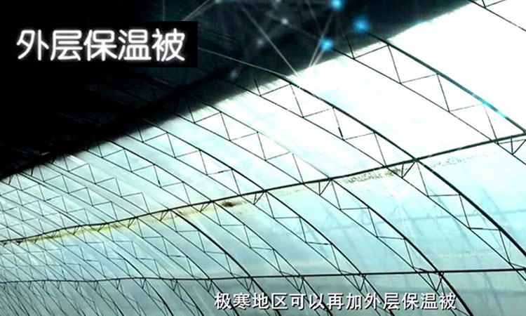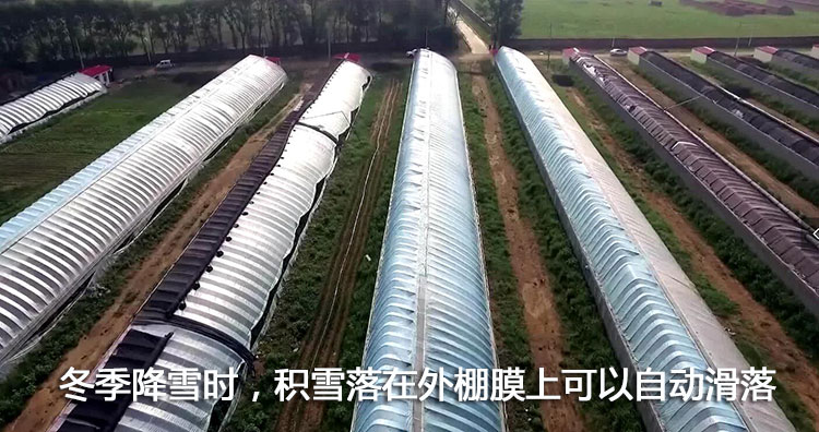內(nèi)保溫日光溫室采用新型防水保溫覆蓋材料,導熱系數(shù)僅為0.038W/(㎡·K),內(nèi)置的保溫被不受雨雪風和太陽直射的影響,使用壽命延長。冬季降雪時,積雪落在外棚膜上可以自動滑落。避免雪災危害,極寒地區(qū)可以再加外層保溫被,形成雙層保溫被,作物可以安全越冬。